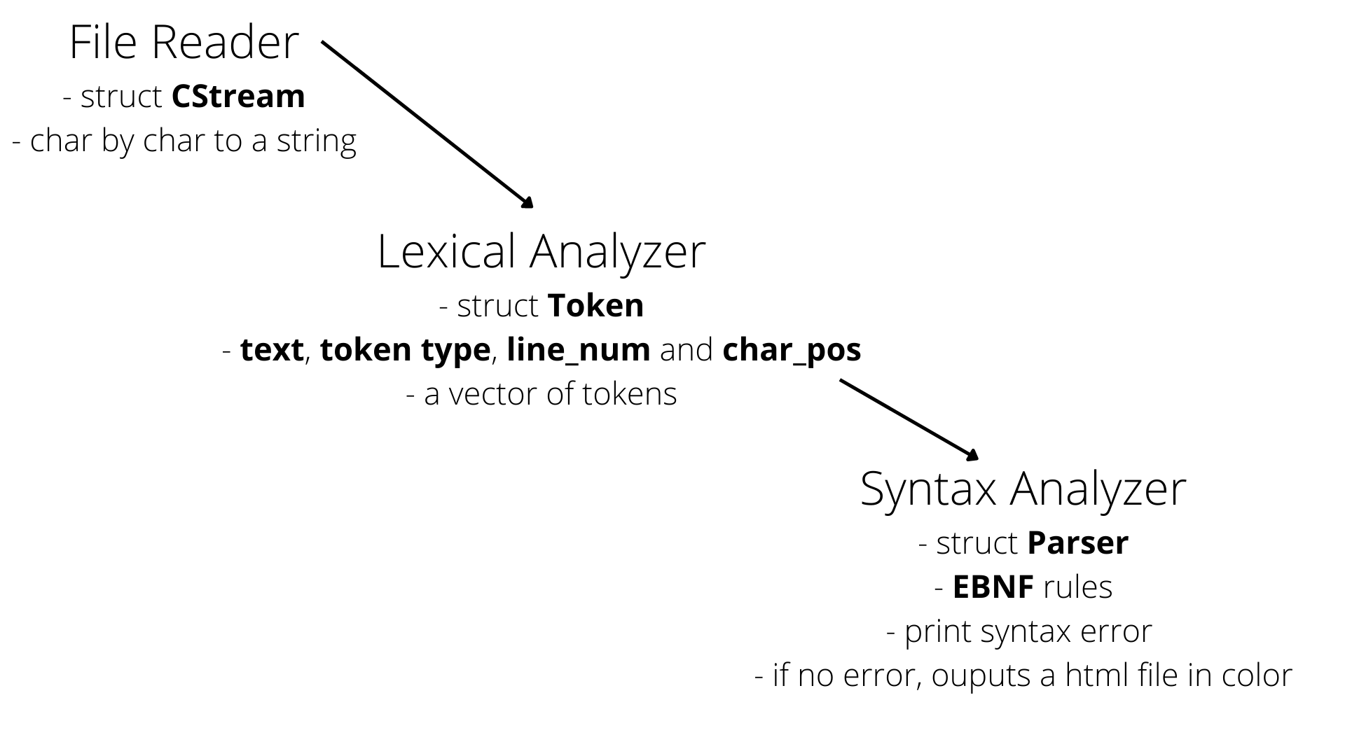 - Defined a CStream struct that is able to read the input file character by character